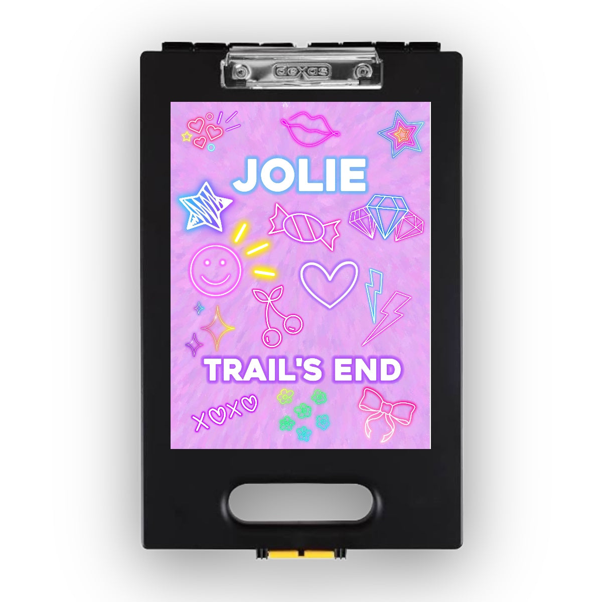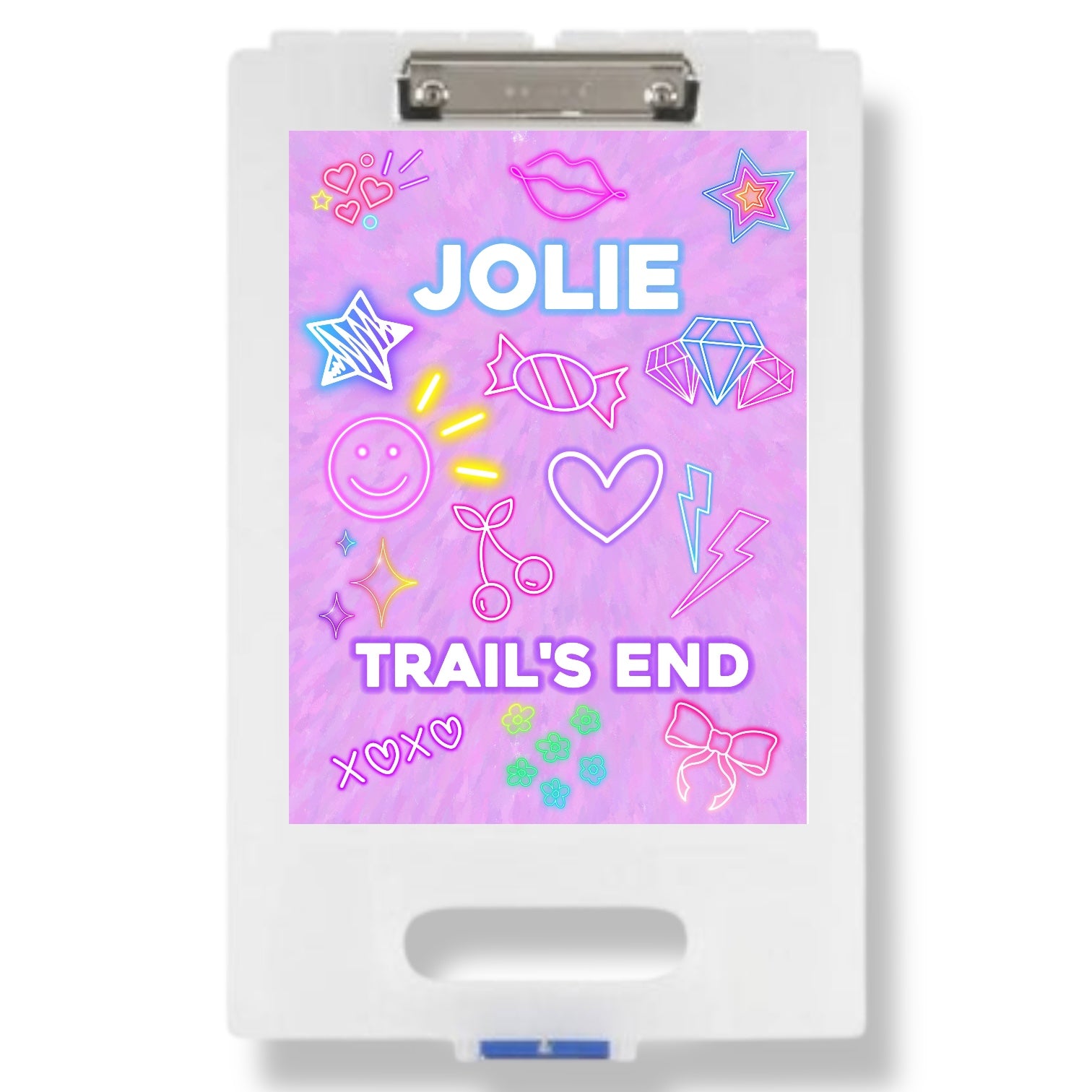 Our Neon Vibes Camp Clipboard features your camper’s custom camp name surrounded by bold, glowing neon-style icons for a look that feels modern, fun, and just the right amount of edgy.