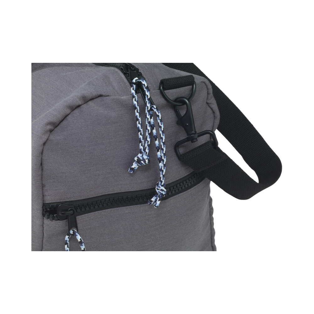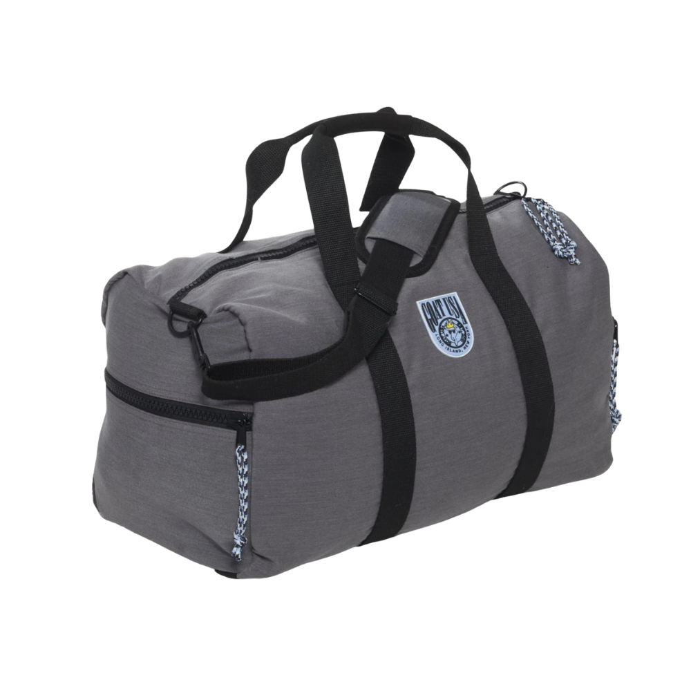 This isn't your average duffle — it's built tough with durable gray canvas fabric and reinforced black nylon straps that can handle real camp life. The adjustable shoulder strap makes it easy to carry, while the front zip pocket keeps essentials within reach.