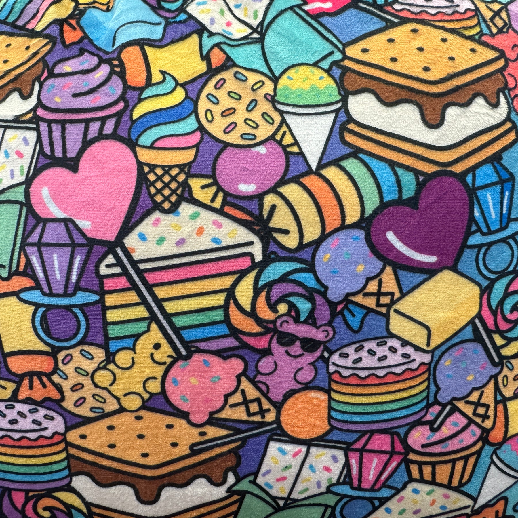 🍭 Candy-covered design with rainbow cake, ice cream, gummy bears, s’mores & ring pops
