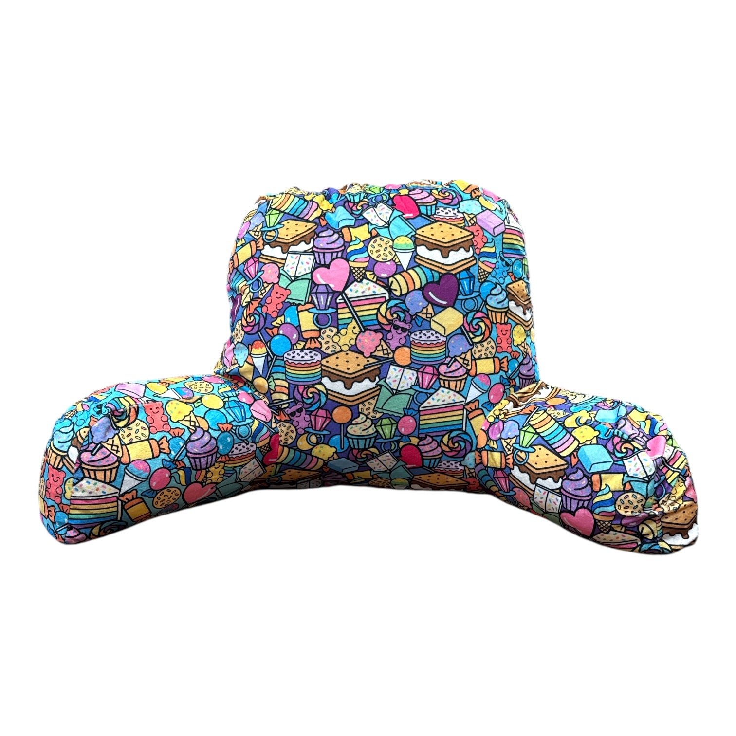 Featuring a dreamy turquoise-to-purple ombré backdrop covered in rainbow cake, rainbow ice cream, gummy bears, s’mores, and ring pops, this pillow is basically a sugar rush for your camper’s bunk.